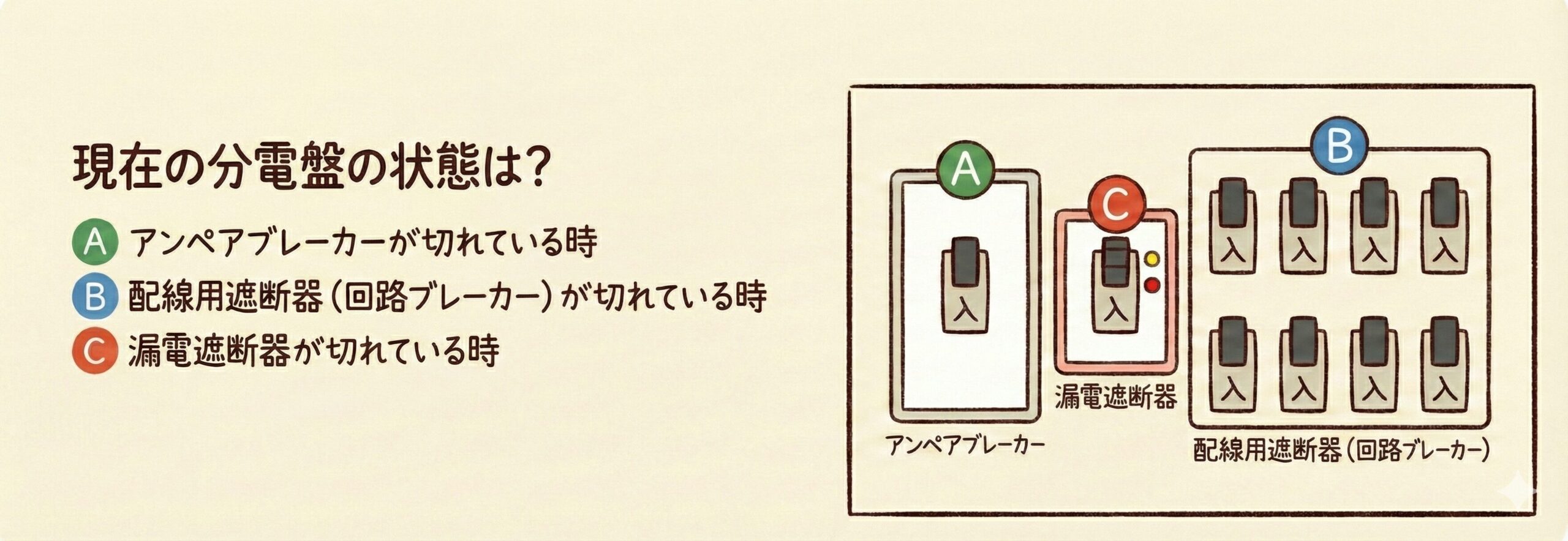 廊下やキッチン、洗面所などに設置されている「分電盤」をご確認ください。つまみが下がっている(「切」になっている)場所によって対応が異なります。
