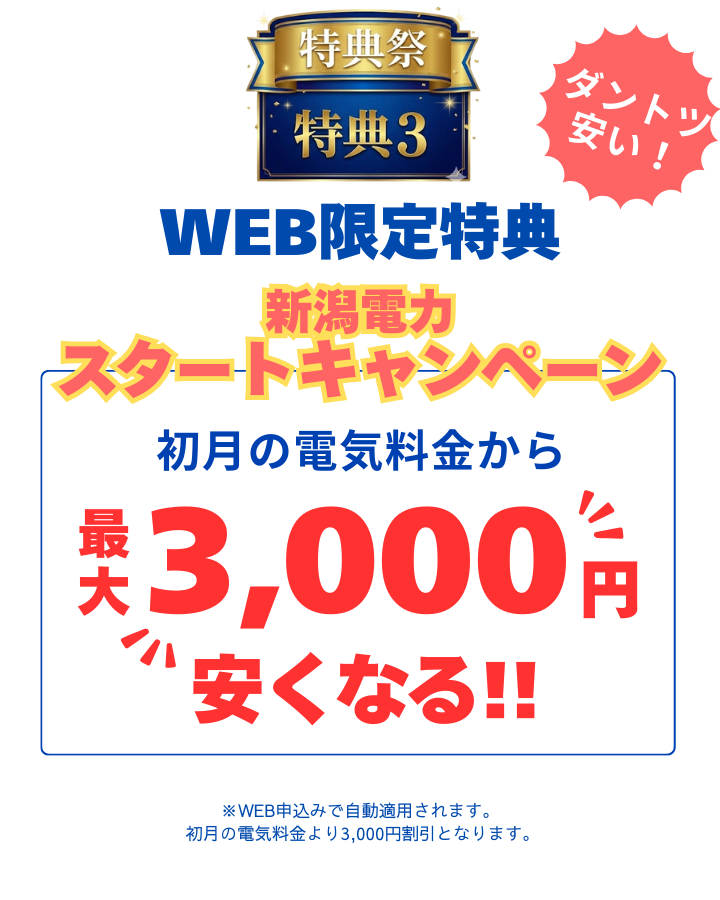 WEBフォームより新規にお申込みいただいたお客様に対し、初月の電気料金から最大3,000円(税込)を割引いたします。